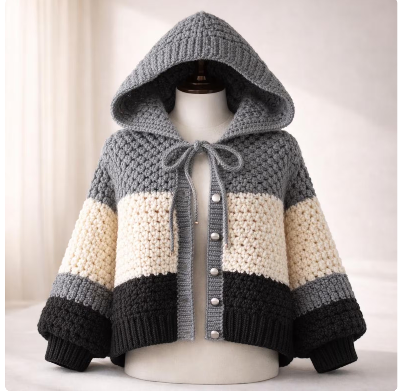 Wrap yourself in handmade-inspired charm with this chic color-block cardigan. Crafted with a thick, textured chunky knit, this piece provides exceptional warmth without sacrificing style. The design features a striking three-tone palette of charcoal grey, creamy ivory, and deep obsidian black, arranged in bold horizontal stripes.