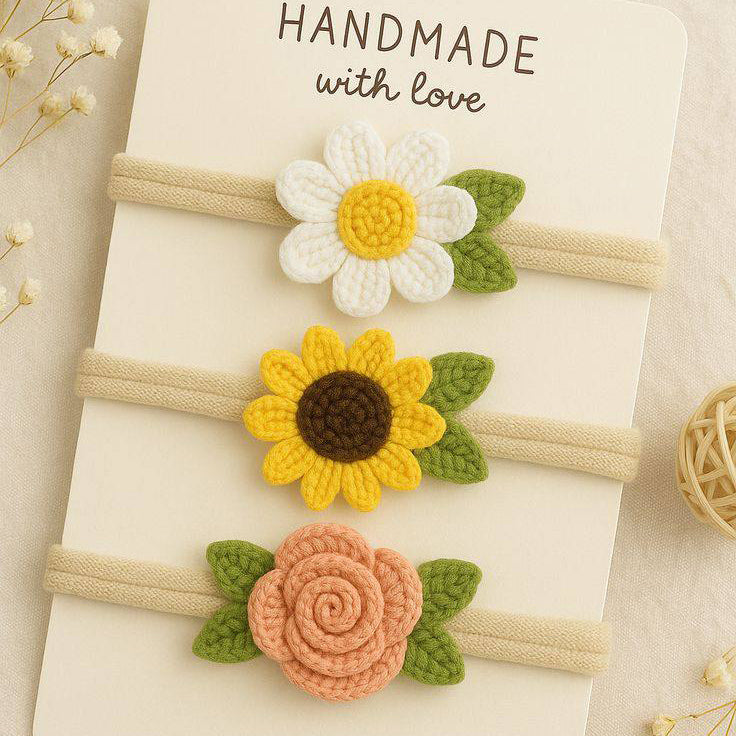 Adorn your baby with the charm of a blooming garden. This handcrafted set of three crochet headbands features our signature botanical designs: a crisp white Daisy, a cheerful Sunflower, and a soft peach Rose. Each piece is meticulously hand-stitched to bring a touch of timeless, handmade elegance to your baby’s wardrobe.