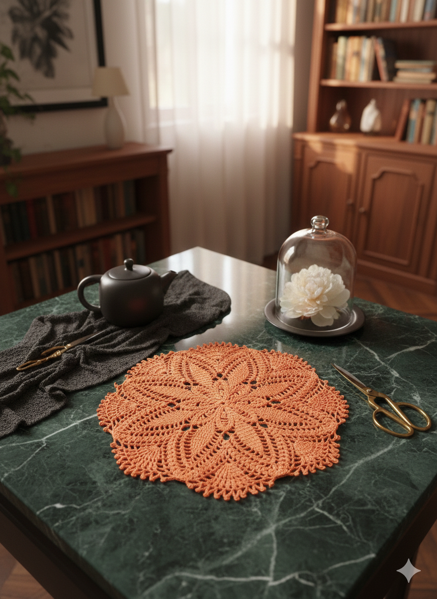 Add a warm, inviting touch to your home with this beautifully handcrafted crochet doily in a rich orange hue. Designed with an elegant floral motif and detailed lace edging, this round doily brings timeless charm and artisanal character to any space.