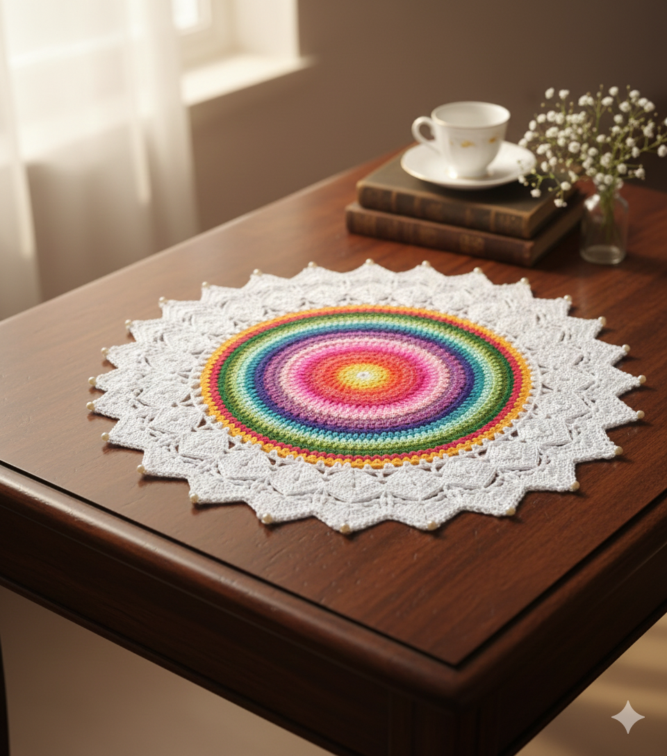This artisan-crafted crochet doily showcases concentric bands of vivid color crowned with an intricate white lace border, delivering authentic handmade quality to your interior. The piece exemplifies traditional crochet techniques while offering versatile styling possibilities—position it as a table accent, placemat, or standalone focal point across coffee tables, dressers, and shelves. Its refined construction suits bohemian, vintage, and cottagecore aesthetics, whilst the radiant rainbow palette complements eclectic décor schemes. Whether anchoring a vignette of candles and ceramics or standing alone as a decorative statement, this doily infuses spaces with both visual warmth and the distinctive character that only handcrafted textiles provide.